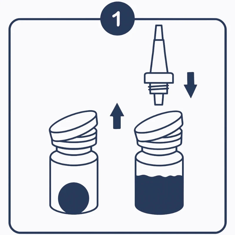 Open one glass vial containing the Seysïa Freeze-Dried Collagen Sphere. Open the second glass vial of Activator Serum and attach the included nozzle.