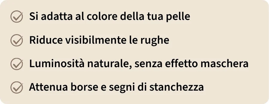Tecnologia dei Pigmenti Adattivi – Micro-capsule intelligenti che si adattano al colore della pelle per una corrispondenza perfetta e naturale.